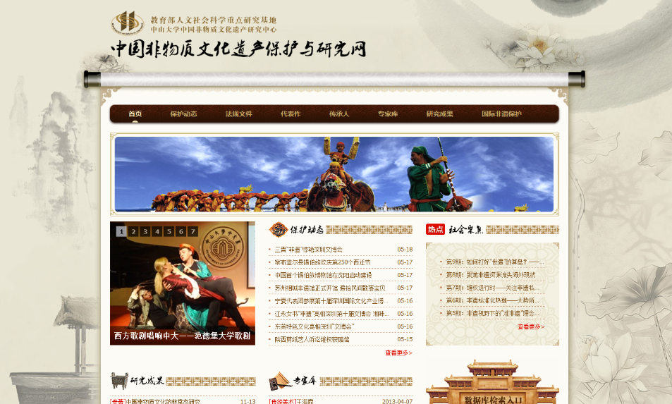 “中国非物质文化遗产保护与研究网”在“985”项目工程经费资助下建立,是针对学术研究者、文化管理部门、普通民众等使用者的专业型非遗数据库。文木以古朴典雅做为网页的主调;利用规范的学术分类方法整合庞杂的非遗数据信息,形成了行之有效的数据采集、整理、分类、保存、展示方法,设置了“保护动态”“法规文件”“代表作”“传承人”“专家库”和“研究成果”等一级栏目,内容设置专业、分类系统完善、具有强大的检索功能,为今后进一步开发动态性数据库奠定了基础。