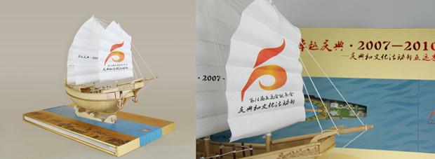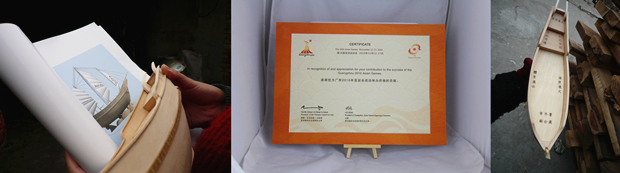 广州亚运会圆满结束后,文木接受亚组委委托,为亚组委运行团队量身定做纪念品套装。根据亚组委的概念性要求,提出了“海心沙之舟”的创意核心,并顺利完成纪念品制作。礼品船的造型来自亚运会奖牌上的“广船”,广船模型紧扣本届亚运会的主题,具有永久的纪念意义,象征岭南人“敢为天下先”的精神。广船与画册之间以海心沙形状的底座连接,画册封面以亚运会开幕式的场景构图,配以隽永高贵的金色,彰显亚运盛事的永久纪念意义。