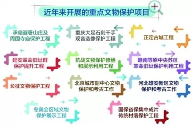 长征文物保护工程:2017年,国家文物局启动“长征——红色记忆工程”。目前已编制完成《长征文化线路总体保护策略研究报告》和《长征文化遗产线路总体保护规划》。