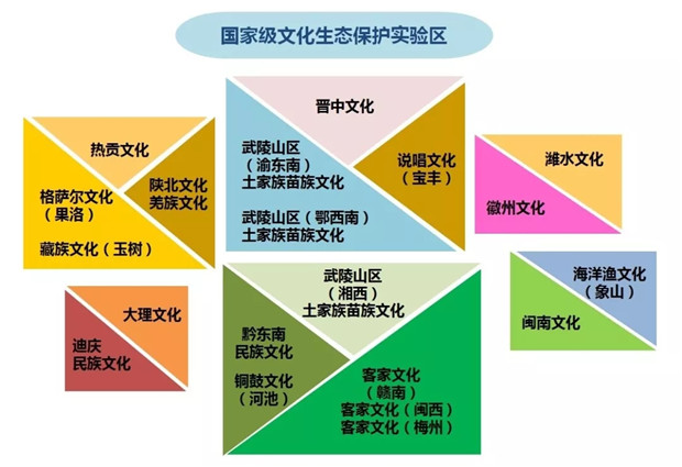 目前,文化部先后批准设立了闽南文化、徽州文化、热贡文化、羌族文化等21个国家级文化生态保护实验区,涉及福建、安徽、青海、四川等17个省(区、市),覆盖102个国家级贫困县。全国19个省(区、市)也设立了范围有大有小、特色鲜明的146个省级文化生态保护区。文化部通过中央财政支持国家级文化生态保护实验区建设经费共计6.8576亿元,支持21个国家级文化生态保护实验区设立了151个非遗综合性传习中心、287个非遗传习点。对晋中、闽南、热贡、羌族等7个国家级文化生态保护实验区组织开展了第三方评估,将评估报告向社会公布。