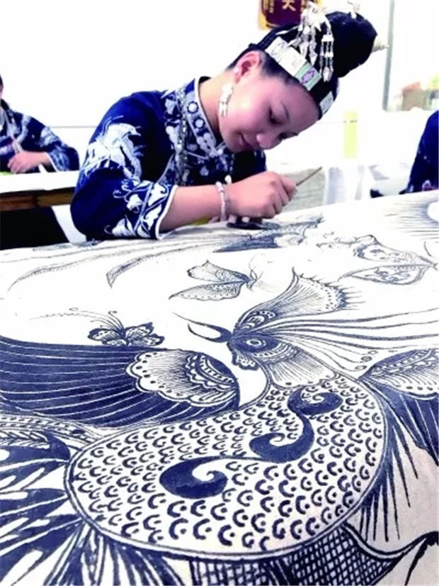 贵州黔东南州丹寨县宁杭蜡染技艺传习所蜡画制作现场