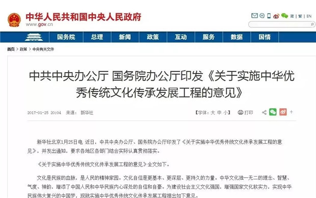2017年1月,中共中央办公厅、国务院办公厅印发了《关于实施中华优秀传统文化传承发展工程的意见》,首次以中央文件形式专题阐述中华优秀传统文化传承发展。《意见》明确提出,实施非物质文化遗产传承发展工程,进一步完善非物质文化遗产保护制度;完善非物质文化遗产普查建档制度;加大对国家重要文化和自然遗产、国家级非物质文化遗产等珍贵遗产资源保护利用设施建设的支持力度;制定文物保护和非物质文化遗产保护专项规划。《意见》对于推动全社会参与非遗保护,形成人人传承发展中华优秀传统文化的生动局面,具有重大意义。