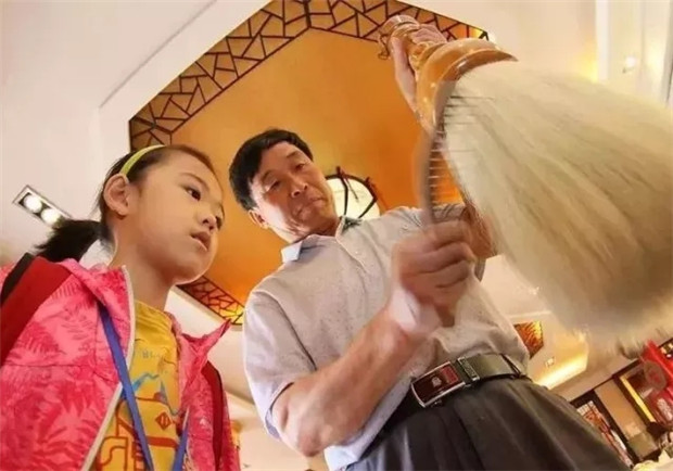 2017年6月10日,在山东烟台毓璜顶公园非遗体验中心,省级非遗项目“莱州毛笔”传承人张庆林向小朋友展示毛笔的制作和保养方法