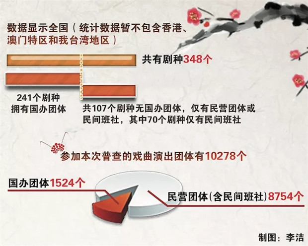 文化部公布的数据显示,截至普查标准时间2015年8月31日,全国有348个剧种(暂不包含香港、澳门特区和我台湾地区)。参加本次普查的戏曲演出团体有10278个,其中,国办团体1524个,民营团体(含民间班社)8754个。目前,241个剧种拥有国办团体;107个剧种无国办团体,仅有民营团体或民间班社,其中,70个剧种仅有民间班社。