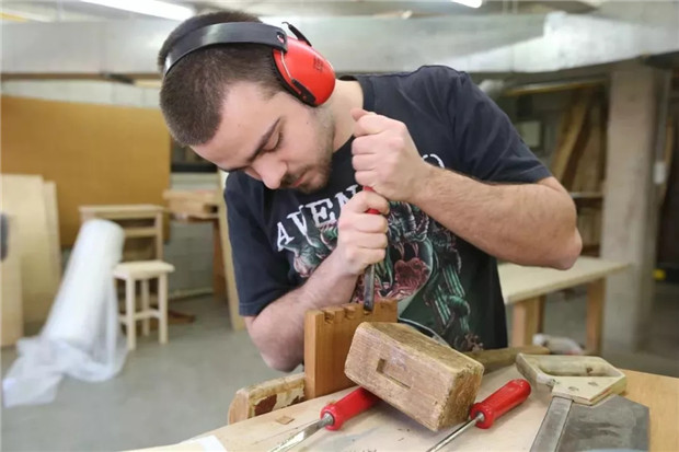 在古旧家具及木工工艺实践课教室,几名学生正在老师的带领下学习锯木和凿木榫。教室内电锯发出尖利的响声,灰尘很大,大家都戴上口罩和耳塞。20岁的洛伊克·马迪亚斯的爷爷和父亲都从事“与木头相关”的工作。他说自己不喜欢“白领”生活,认为那种生活限制了个人自由和想象力的发挥,没有创造力。另外,家庭的影响也非常直接,看到一件件古旧家具在家人的修理下焕发青春,看到顾客收到定制家具时的欢乐表情,他十分满足。他说,人各有志,只要能发挥出自己的才能,将来能够用自己的产品让顾客满意就够了。他想毕业后先找一位木匠作坊实习一段时间,学以致用,以后成立一家独立的工匠作坊,修复古旧家具,同时也定制各类现代实用家具。
