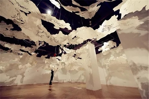 作品的基本材料是有着800余年传承历史的国家级非遗———手工傣纸,艺术家以现代激光雕刻技术将其进行造型雕刻制作而成。参观者可身临“云境”,感受傣纸制成的不同大小的“云”,感受被云层环绕的感觉。