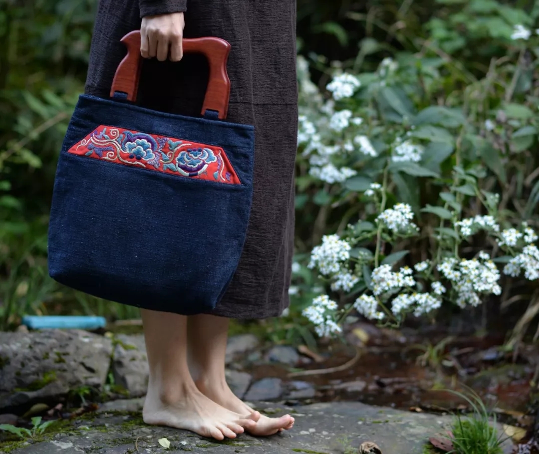 手织土布为原料的绣片木柄古布包,手工缝制,加入老绣片元素,每一款都是独一无二