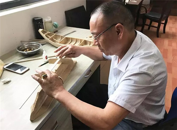 他隔壁的一间工作室里,罗店龙船技艺传承人张国忠,正在专心致志地打磨一条小型龙船。他一般上午8点至下午4点在这里“上班”,晚上在村里联防队工作。比起之前在家里做龙船,这样的宽敞空间也让他直呼“非常好”。