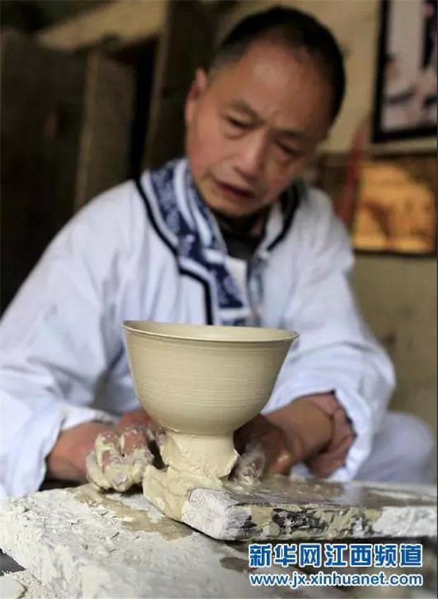 国家非遗传承人王炎生在景德镇古窑民俗博览区古陶瓷制作坯房内拉坯