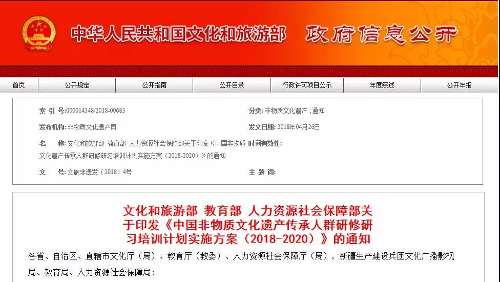 文化和旅游部官网消息,为落实中央《关于实施中华优秀传统文化传承发展工程的意见》,推动中华优秀传统文化创造性转化、创新性发展,提升非物质文化遗产保护传承能力和水平,文化和旅游部、教育部、人力资源社会保障部将共同实施中国非物质文化遗产传承人群研修研习培训计划。
