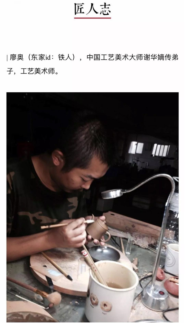 广东潮州手拉朱泥壶手工艺从业者廖奥在“东家”以网名“铁人”知名