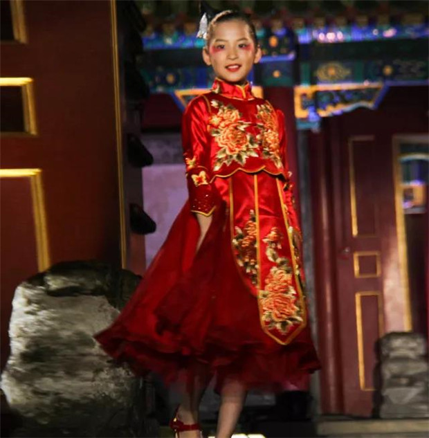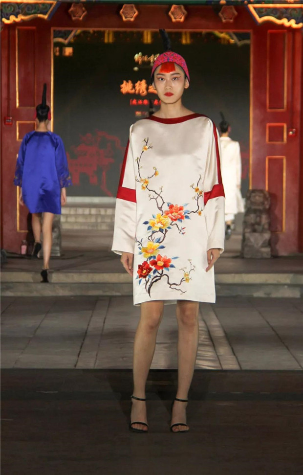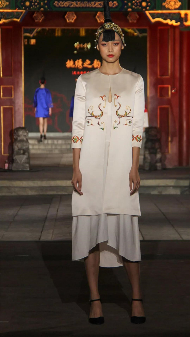 第二部分:绣花服饰。分布在湖北各地的的武汉汉绣、红安绣活、荆州汉绣、荆州民间绣活、大冶刺绣以及阳新布贴,历史悠久,可以追溯到东周时期的楚绣。他们色彩鲜明富丽、线条挺拔分明、造型拙朴生动、绣迹粗狂奔放、气氛浓烈祥和、针法规范灵巧,其中以汉绣盘金绣尤为突出,产生屈原的《楚辞?招魂》中“翡翠珠被,烂齐光些”的效果,呈现楚文化富于想象的表现手法和浪漫主义的艺术特色。绣花服饰设计采用简洁大方的连衣裙款,缎面重磅真丝面料沉稳贵气。汉绣等荆楚刺绣的经典图案在真丝面料上光彩夺目,牡丹花卉、金龙祥云,金丝银线,相得益彰。