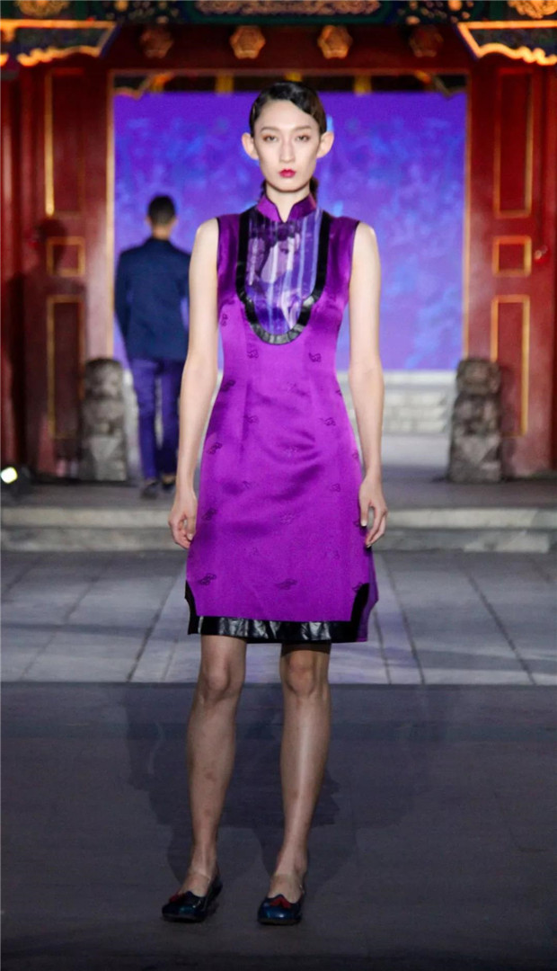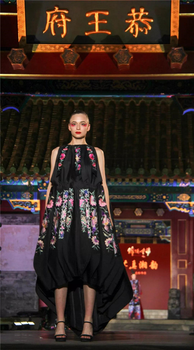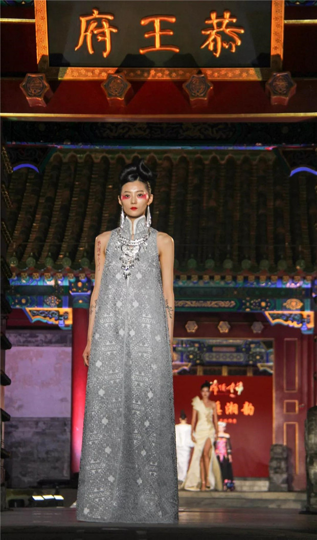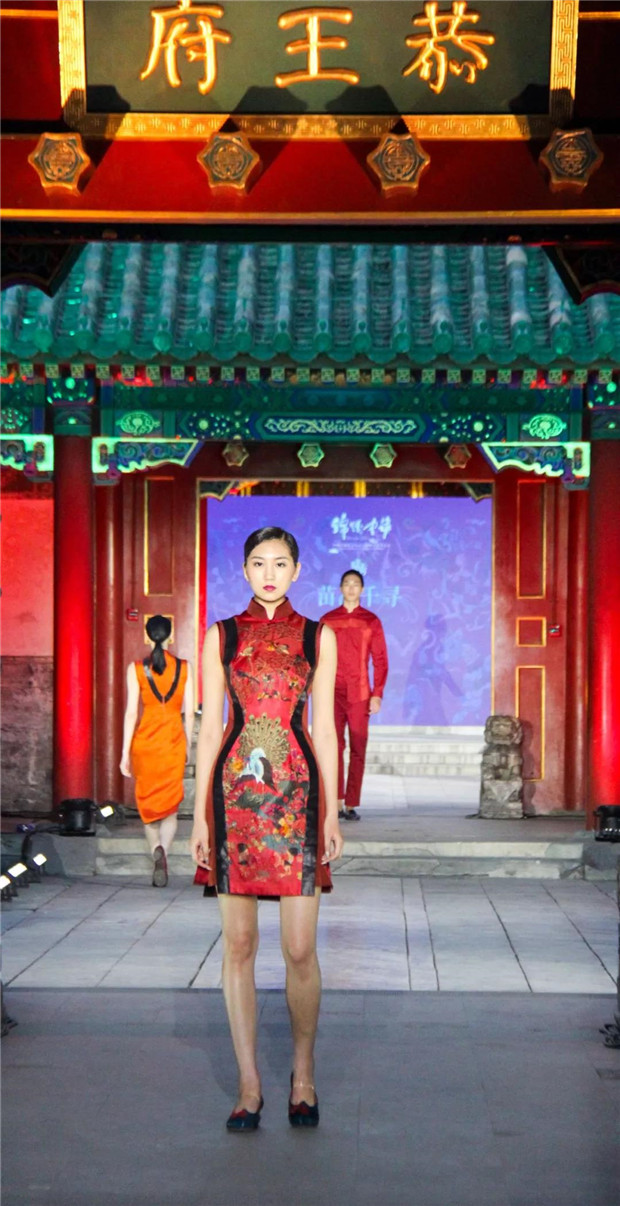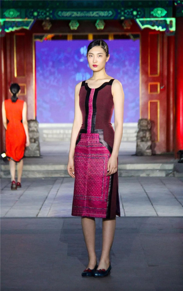 而今天,“苗净千寻”带着对民族文化的虔诚,用国际化的设计语言对话中国保存最完整的清代王府建筑群——恭王府。“苗净千寻”非遗服饰秀将苗族服饰中最典型的紫色、玫红配以黛绿、群青及墨黑提炼出来,呈现出神秘而优雅的色调;而苗族精美生动的织、绣图案记载了对生活的热爱和对美无与伦比的创造力。设计师倾心于中国非物质文化遗产宝库,苗绣特有的辨绣、打籽绣、叠绣、破线绣、皱绣、马尾绣、锁绣等技艺都在服装服饰中得以体现。并匠心独运,将刺绣图案中的故事作为设计传递的文化重点。