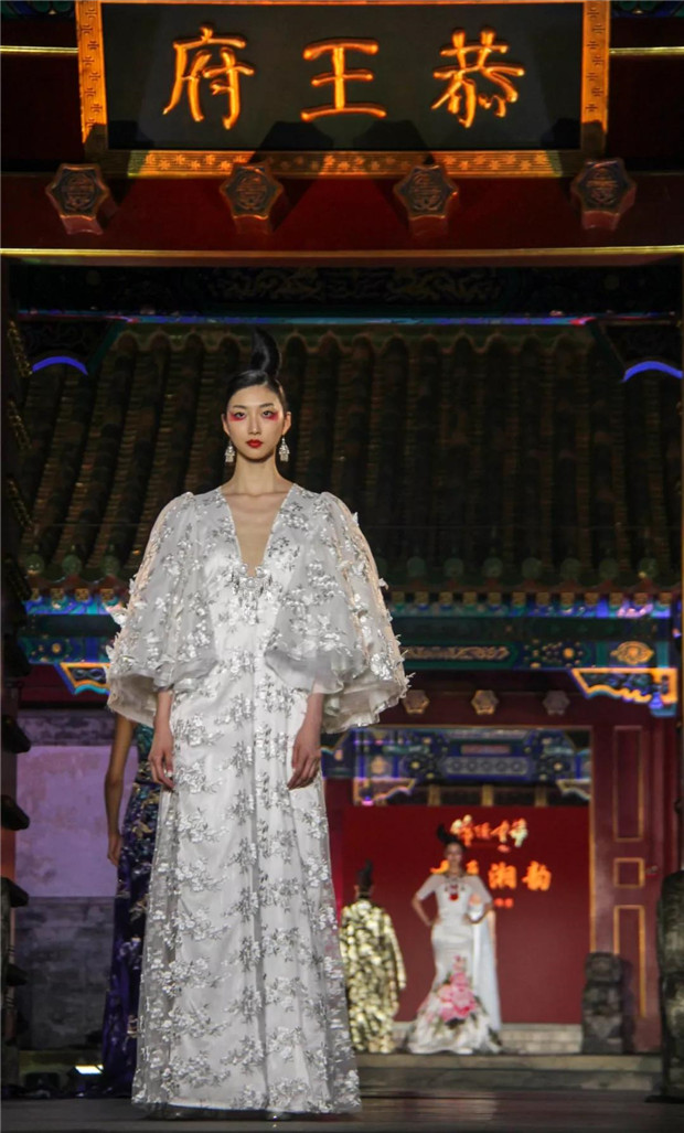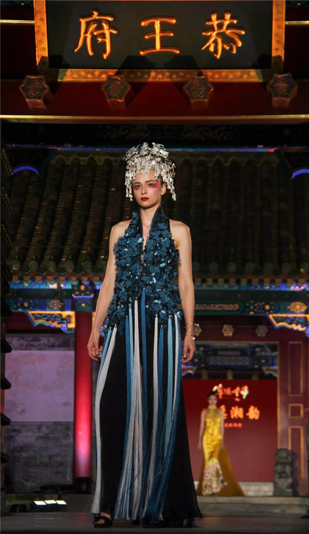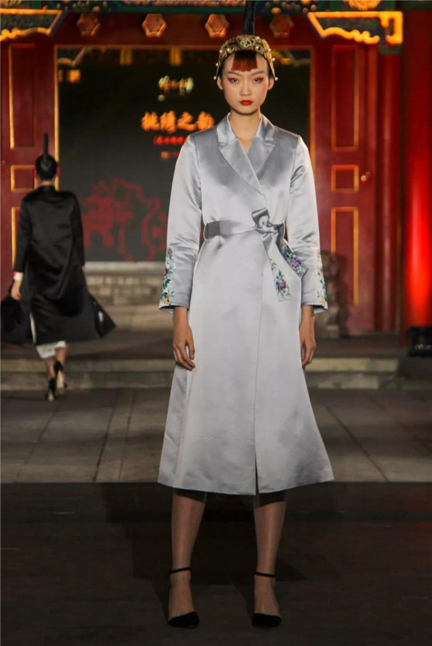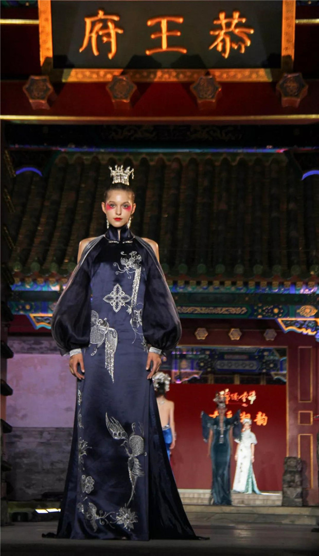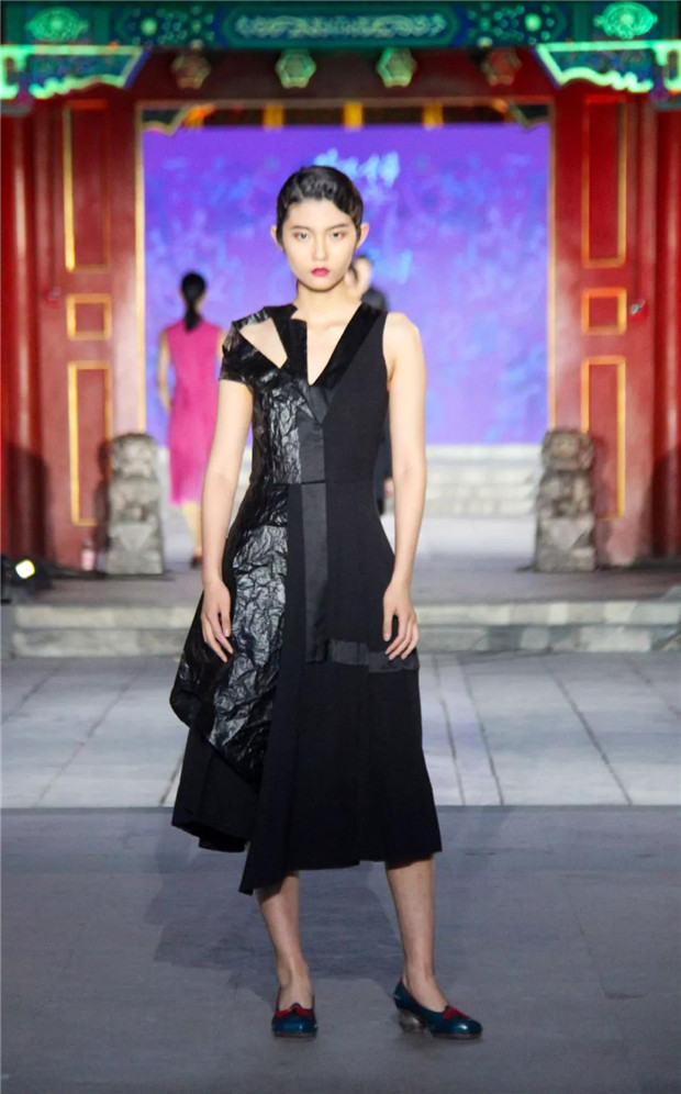 而今天,“苗净千寻”带着对民族文化的虔诚,用国际化的设计语言对话中国保存最完整的清代王府建筑群——恭王府。“苗净千寻”非遗服饰秀将苗族服饰中最典型的紫色、玫红配以黛绿、群青及墨黑提炼出来,呈现出神秘而优雅的色调;而苗族精美生动的织、绣图案记载了对生活的热爱和对美无与伦比的创造力。设计师倾心于中国非物质文化遗产宝库,苗绣特有的辨绣、打籽绣、叠绣、破线绣、皱绣、马尾绣、锁绣等技艺都在服装服饰中得以体现。并匠心独运,将刺绣图案中的故事作为设计传递的文化重点。