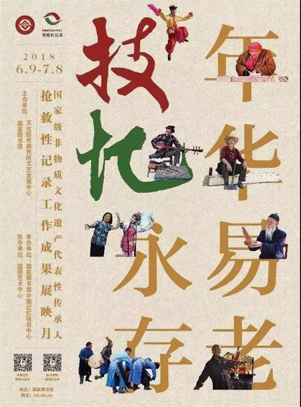 6月9日是“文化和自然遗产日”,国家图书馆将启动“年华易老,技· 忆永存——国家级非物质文化遗产代表性传承人抢救性记录工作成果展映月”系列活动,包括纪录片展映、主题活动、优秀成果推介会、主题展览等。