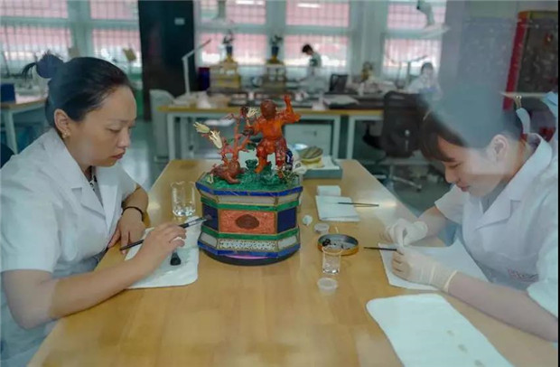 修复师在故宫文物医院修复室内修复故宫收藏的文物
