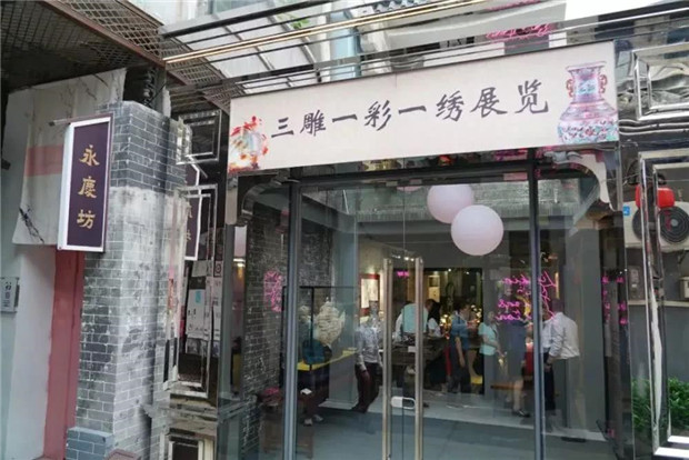 这一带原本是挤满老房危房的老社区。2015年,广州用修旧如旧的修缮理念保留了旧城风貌,并把创客空间、文化创意等吸引年轻人的产业引入这里,让历史街区再现活力和新意。如今,永庆坊是隐藏在广州老城中的一颗宝石。习近平首先走进永庆坊入口处的广州“三雕一彩一绣”展览。