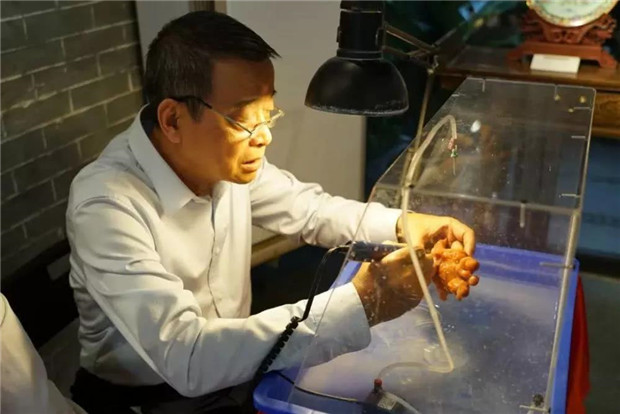 △国家级非物质文化遗产代表性项目玉雕(广州玉雕)代表性传承人高兆华正在用金丝玉雕刻《送子观音》(央视记者 沈忱拍摄)